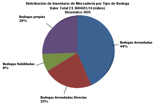 | | | | ALMLAFISE | ALMEXSA | ALFIBAC | TOTALES | | MERCANCIAS ALMACENADAS | 2,080,294.11 | 1,192,726.76 | 421,412.27 | 3,694,433.14 | | Mercaderías en Depósito Financiero | 522,097.62 | 1,122,161.72 | 224,180.31 | 1,868,439.65 | | Mercaderías en Depósito Fiscal | 769,957.00 | 0.00 | 0.00 | 769,957.00 | | Mercaderías en Depósito Corriente | 3,538.58 | 60,685.18 | 197,231.96 | 261,455.73 | | Mercaderías en Depósito Simple | 784,700.90 | 9,879.86 | 0.00 | 794,580.76 | | MERCANCIAS ALMACENADAS POR TIPO DE BODEGA | 2,080,294.11 | 1,192,726.76 | 421,412.27 | 3,694,433.14 | | Bodegas propias | 941,116.70 | 0.00 | 0.00 | 941,116.70 | | Bodegas Arrendadas Directas | 827,506.61 | 11,231.96 | 0.00 | 838,738.57 | | Bodegas Arrendadas | 5,973.44 | 1,181,494.80 | 421,412.27 | 1,608,880.51 | | Bodegas Habilitadas | 305,697.36 | 0.00 | 0.00 | 305,697.36 |