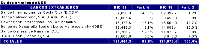 Representación de Bancos Extranjeros ascendió a US$121.9 millones, registrando