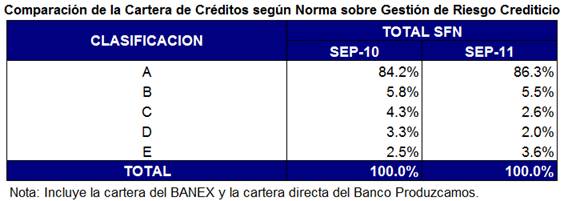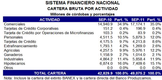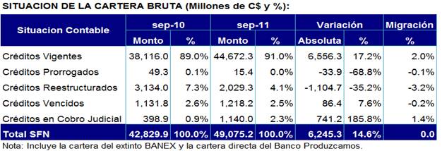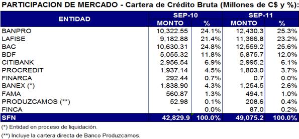 A septiembre de 2011, la cartera de créditos bruta se situó en C$49,075.2 millones, considera la cartera del BANEX, entidad en liquidación, y la cartera directa del Banco Produzcamos. La participación de mercado se encuentra distribuida entre las instituciones financieras de la siguiente manera: